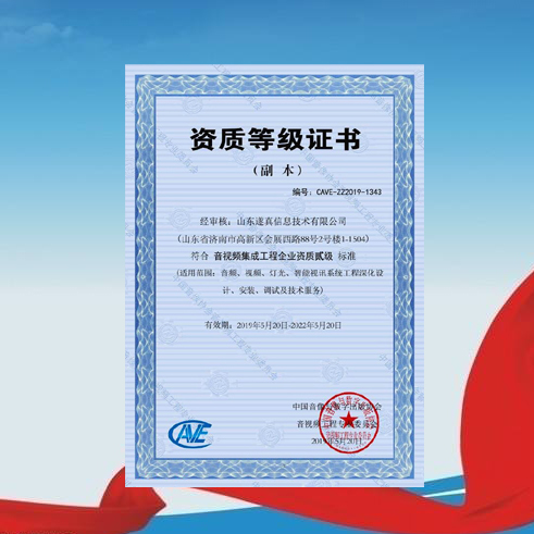 公司獲得中國音像協(xié)會(huì)音視頻工程專業(yè)委員會(huì)頒發(fā)的《音視頻集成工程企業(yè)資質(zhì)貳級》證書,成為省內(nèi)首批通過該權(quán)威機(jī)構(gòu)認(rèn)證的二級資質(zhì)企業(yè)。